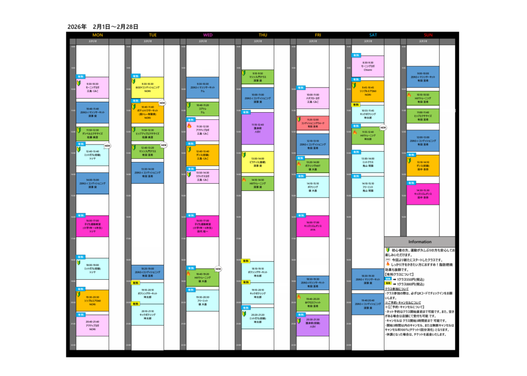 2026.2月1日~2月28日までのクラススケジュールをご案内いたします。