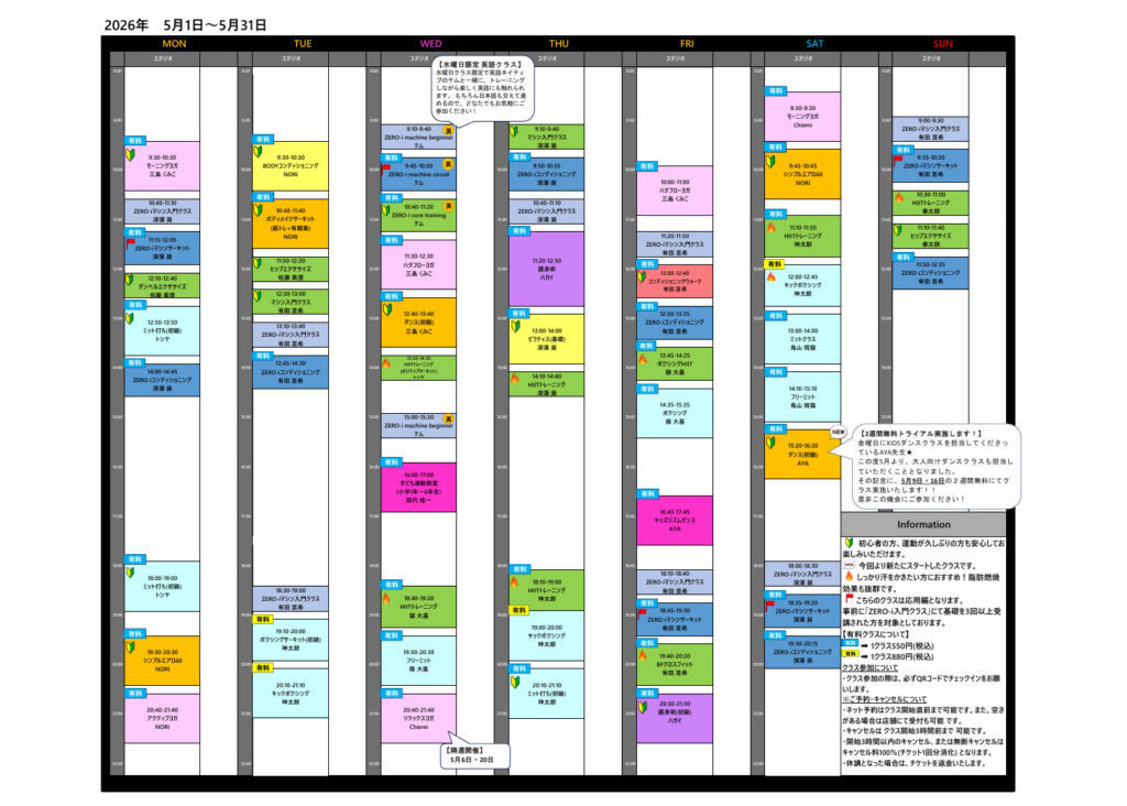 2026.5月1日~5月31日までのクラススケジュールをご案内いたします。